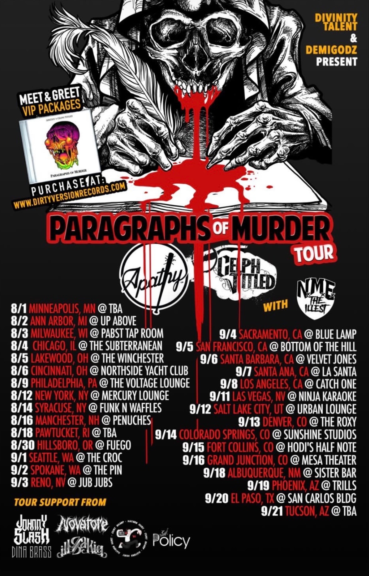 The underground hip-hop world is gearing up for a major run as Divinity Talent and the legendary collective Demigodz present the “Paragraphs of Murder Tour,” headlined by lyrical heavyweights Apathy and Celph Titled. The tour will tear through the western United States with stops across OregonWashingtonCaliforniaNevadaUtahColoradoNew MexicoTexas, and Arizona, bringing a raw, bar-for-bar showcase of underground hip-hop to stages across the region.